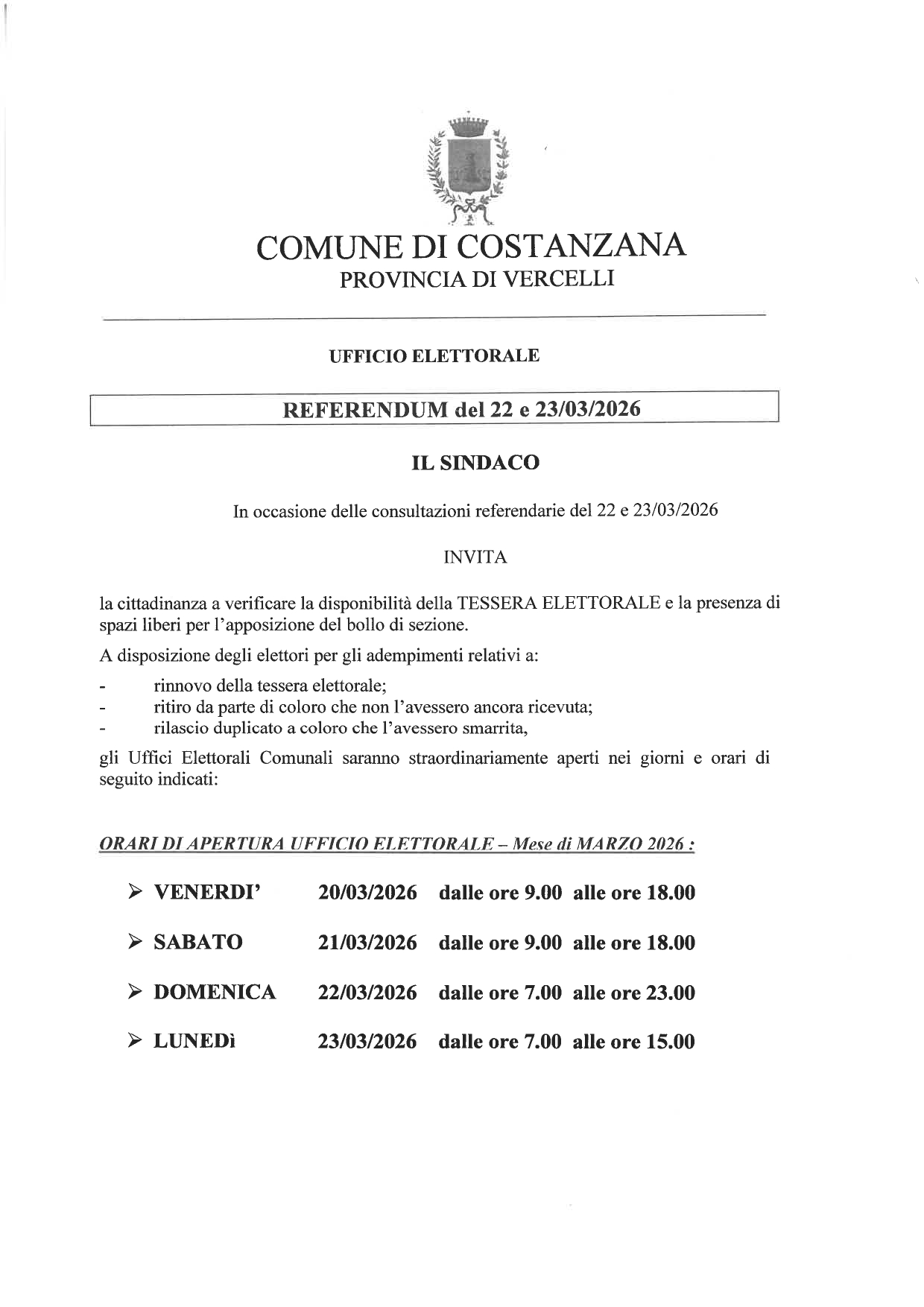 apertura straordinaria dell'ufficio elettorale in occasione dei referendum del 22 e 23 marzo 2026